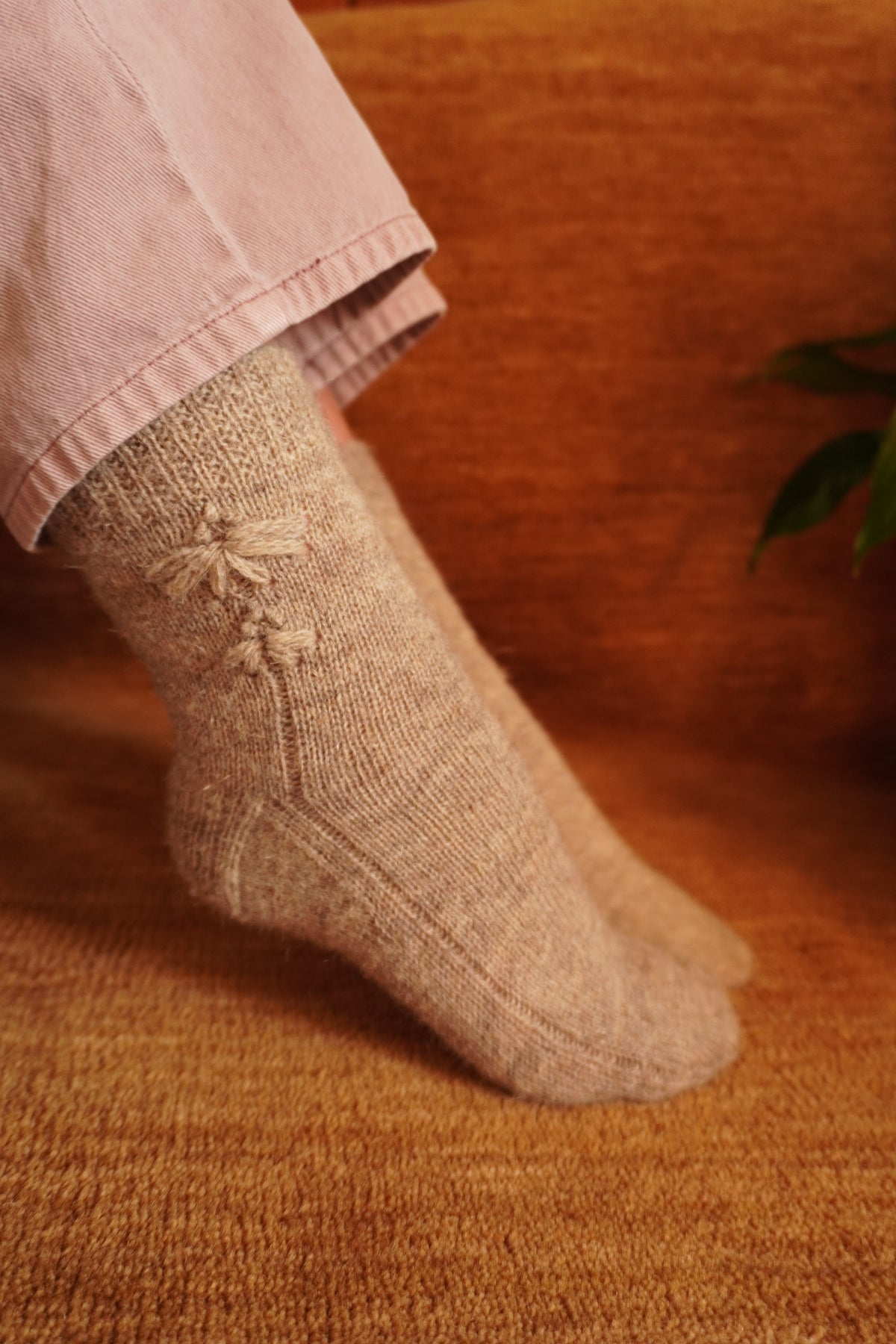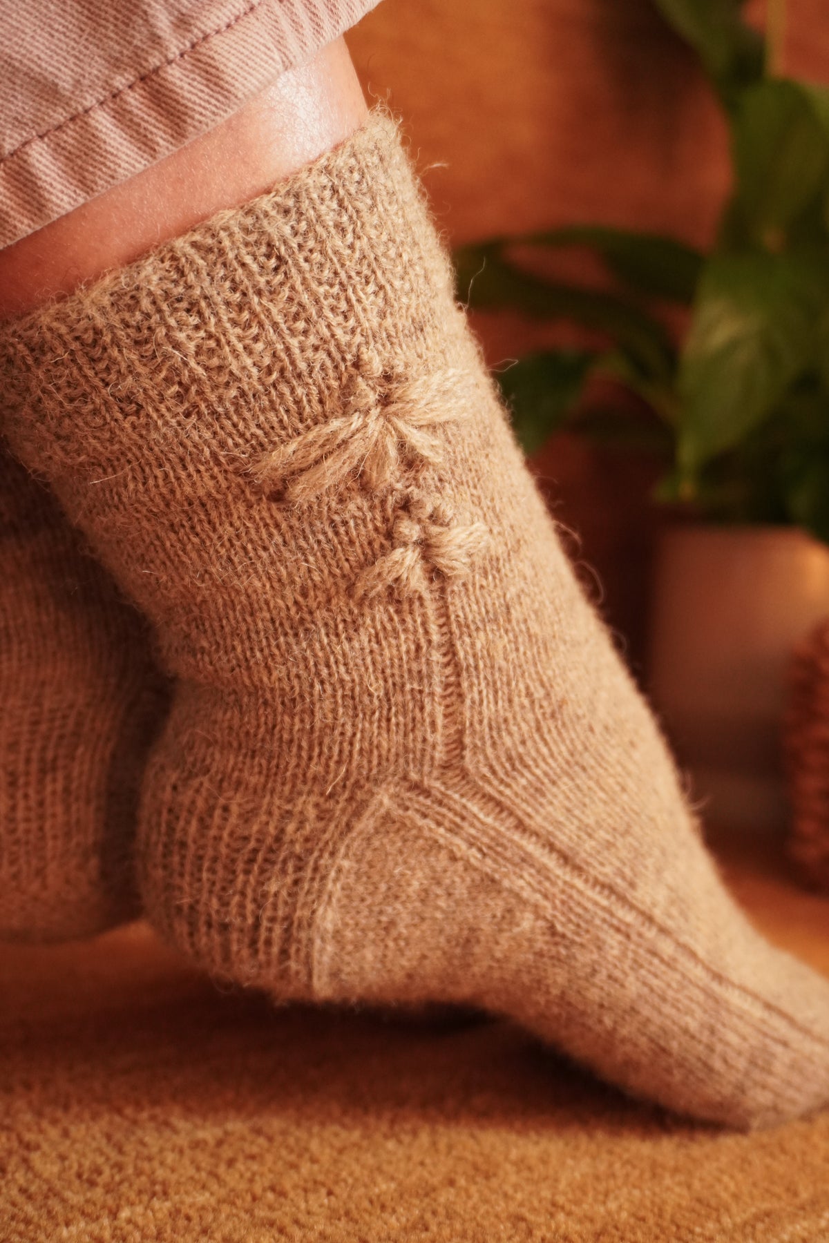 Les chaussettes Linum se tricotent des côtes vers la pointe avec des côtes brisées, un talon double texturé, un gousset et une pointe traditionnelle. Un motif floral orne le côté externe de chaque chaussette. Ce motif est réalisé en créant des noppes, des œillets et une tige sur la jambe, à même le tricot. Les œillets servent ensuite de guides pour broder des pétales une fois la chaussette terminée.