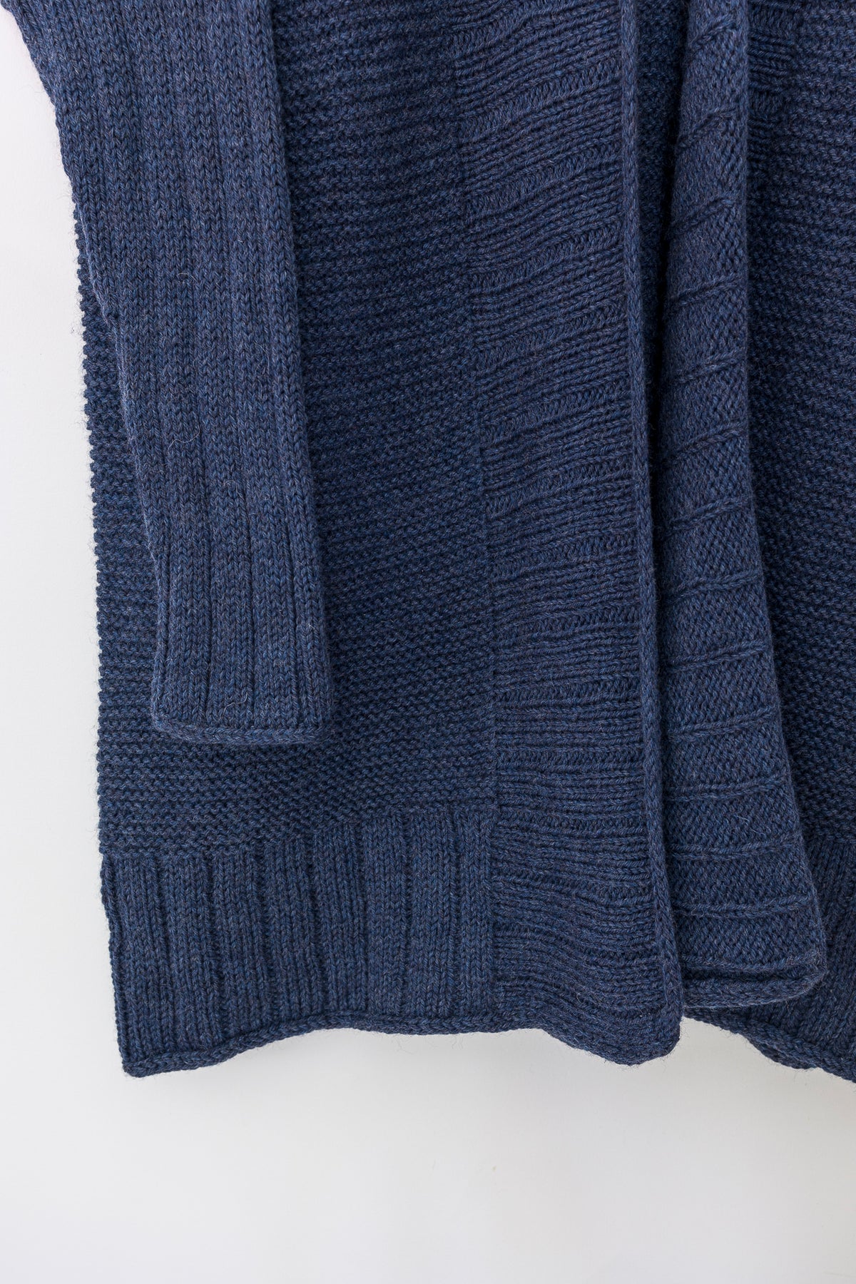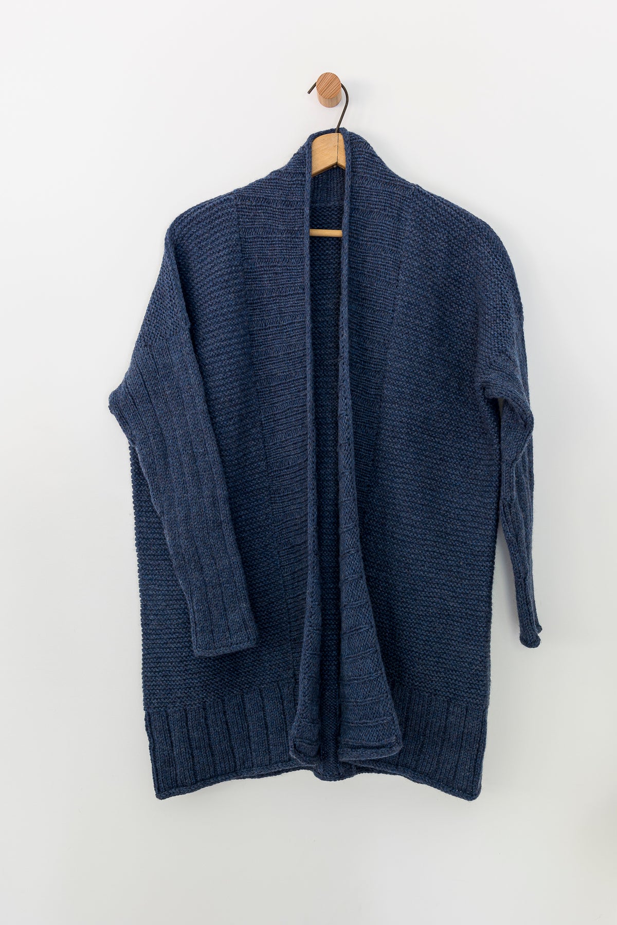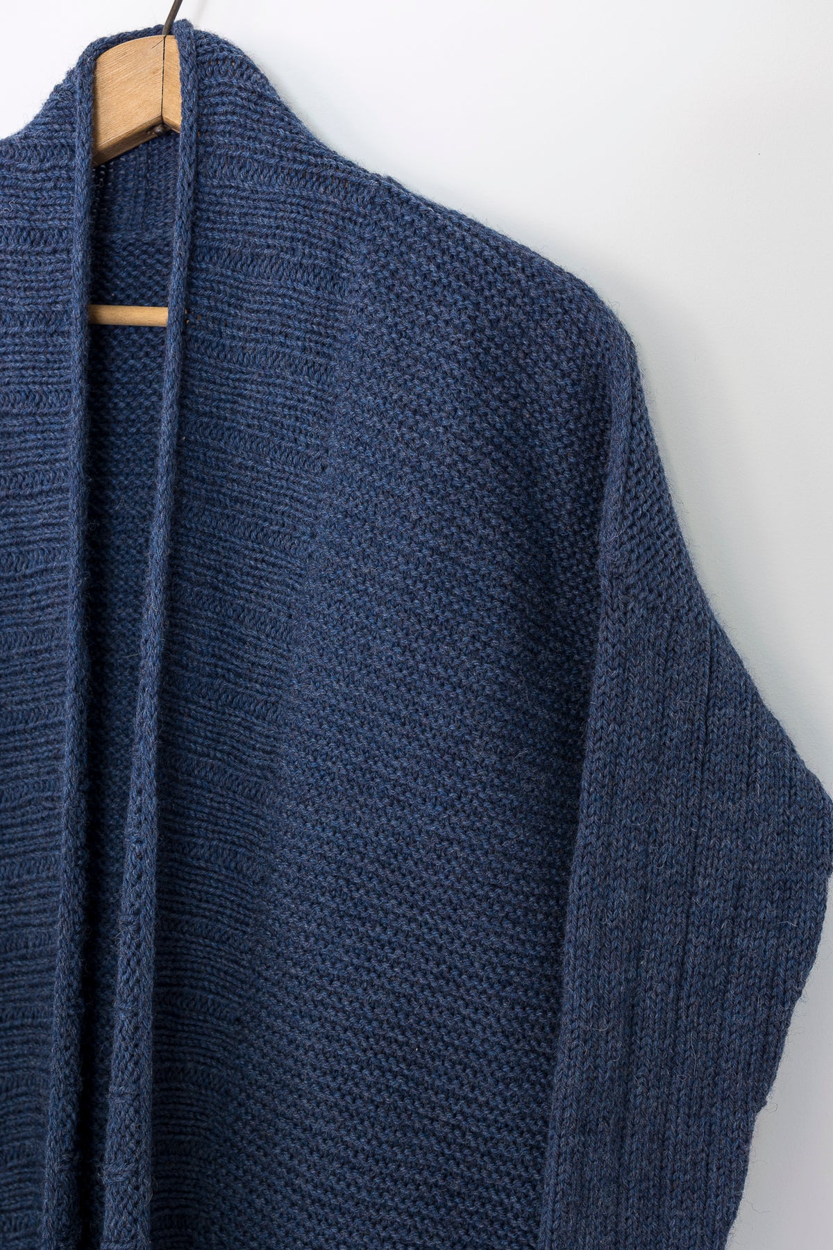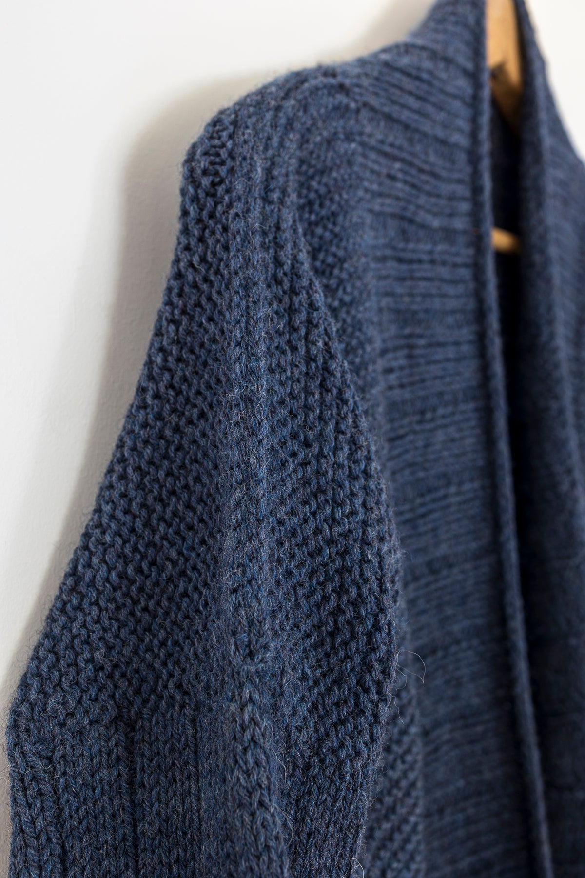 Le vêtement est tricoté du haut vers le bas, en point mousse, les mailles sont relevées pour tricoter les sections en côtes plates. Les manches sont tricotées en rond, et le col surdimensionné, à plat. Les finitions simples et élégantes sont réalisées en dernière étape à l’aide de délicates bordures de type I-cord.