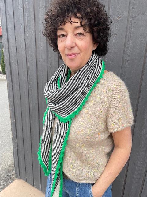 ''Beyond the lines'' (Au -delà des lignes) est un châle avec un motif de rayures facile à mémoriser. C'est un modèle rapide à réaliser. Il peut être porté parfaitement pour les activités quotidiennes avec n'importe quelle tenue.