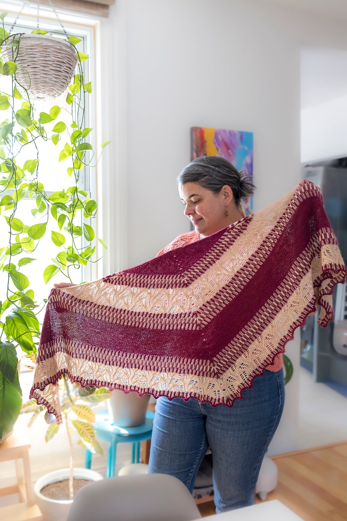 Ce châle en deux couleurs est tricoté du haut vers le bas. Les augmentations à chaque rang endroit lui donnent sa forme de triangle symétrique. Le ratio des augmentations : une augmentation au centre pour deux sur les côtés. Ce ratio permet de créer plus de longueur par rapport à la profondeur.