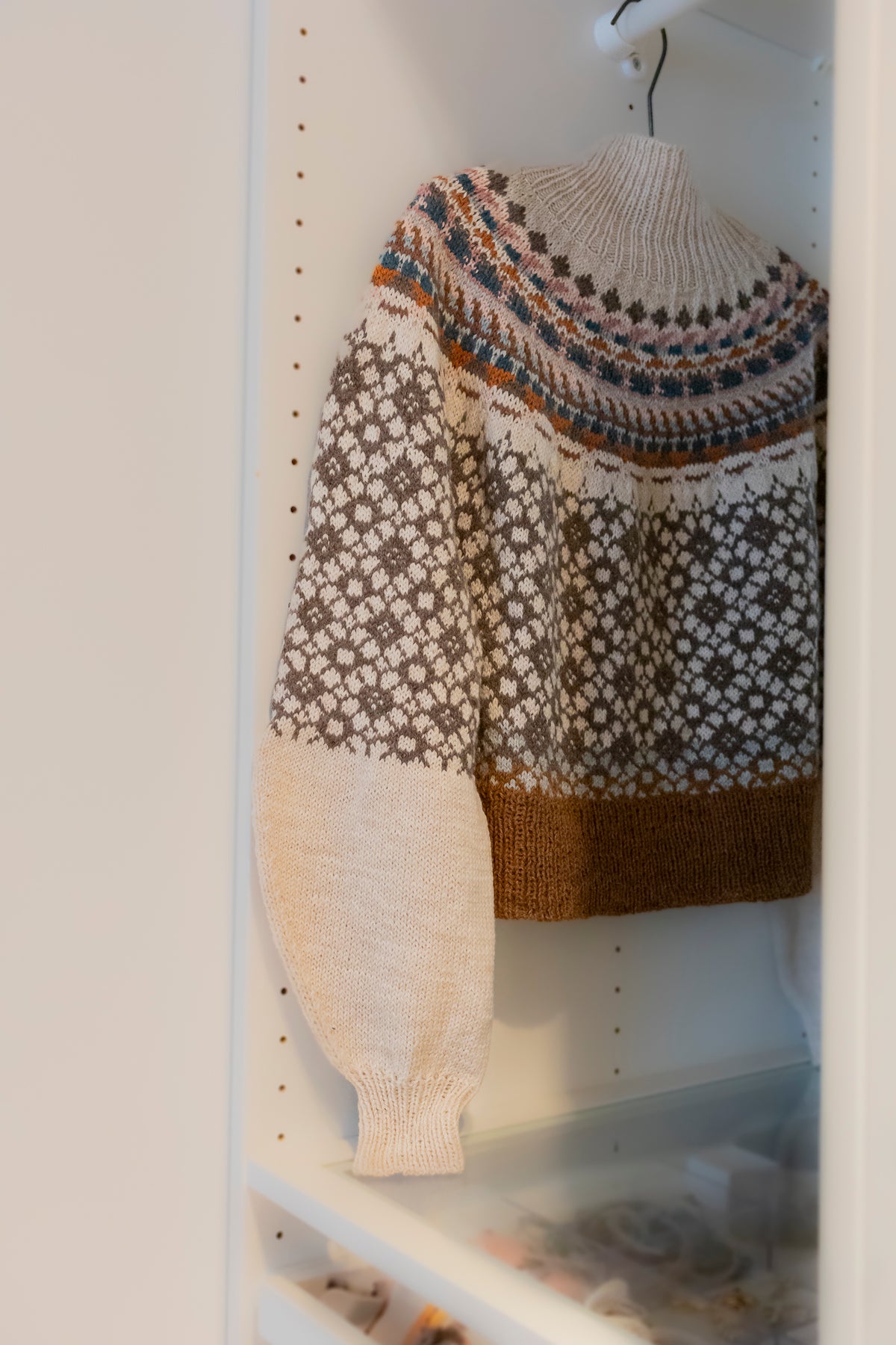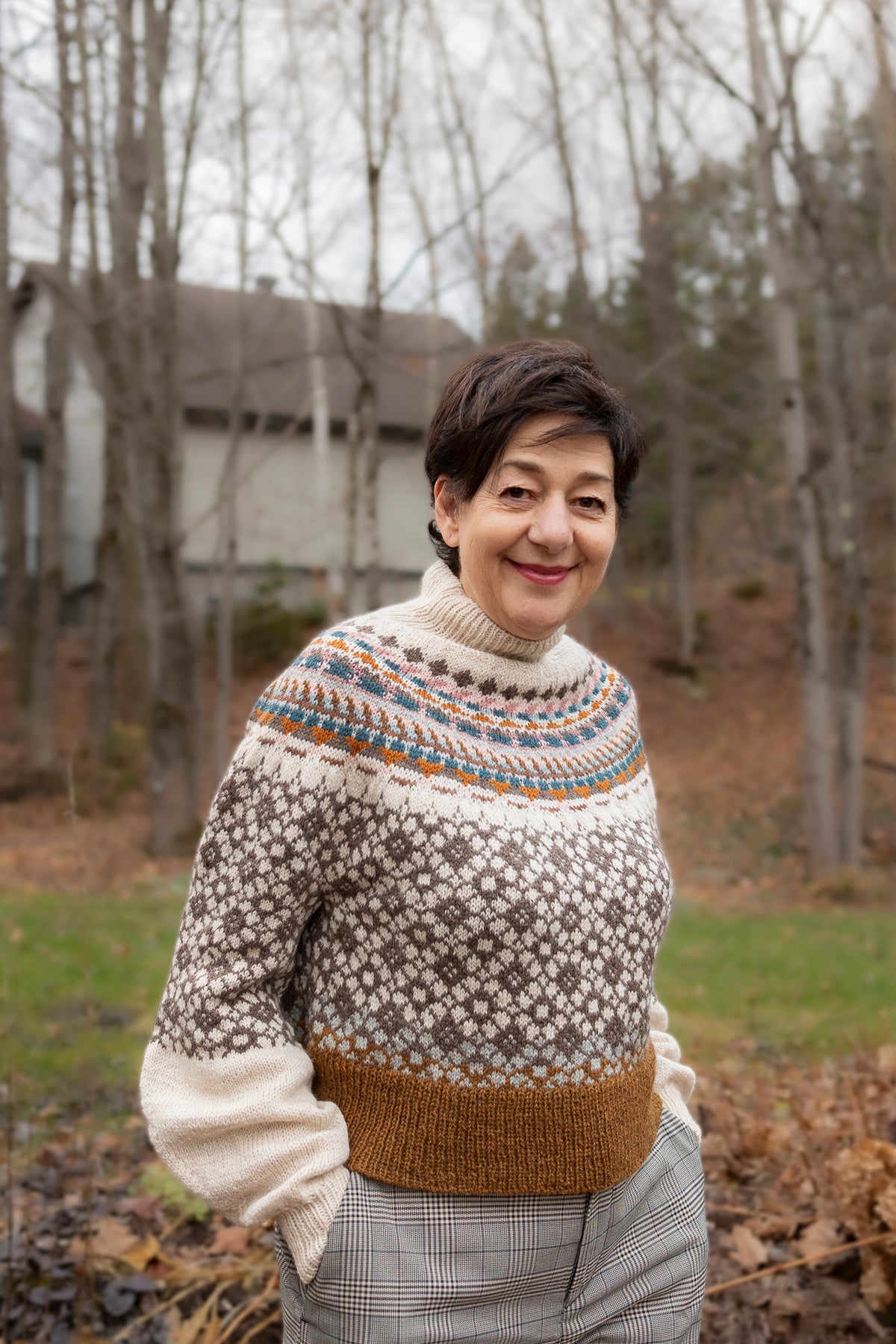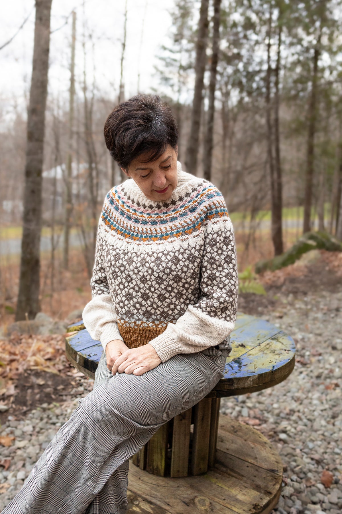 Ce pull a un petit col roulé, et est tricoté entièrement en rond, du haut vers le bas. L’empiècement est un peu resserré au niveau des épaules, puis s’élargit avec beaucoup plus d’aisance au niveau du corps et des manches. Le bas du corps est assez haut (« cropped » en anglais) et resserré au niveau de la bordure pour lui donner une allure arrondie flatteuse autour de la taille. Les manches de longueur-bracelet ont une forme arrondie, grâce à des diminutions placées sur la moitié du bas. Le bas des manches est ensuite resserré en poignets bien ajustés afin d’accentuer la forme ronde façon cocon de ce pull très moderne en Fair Isle.