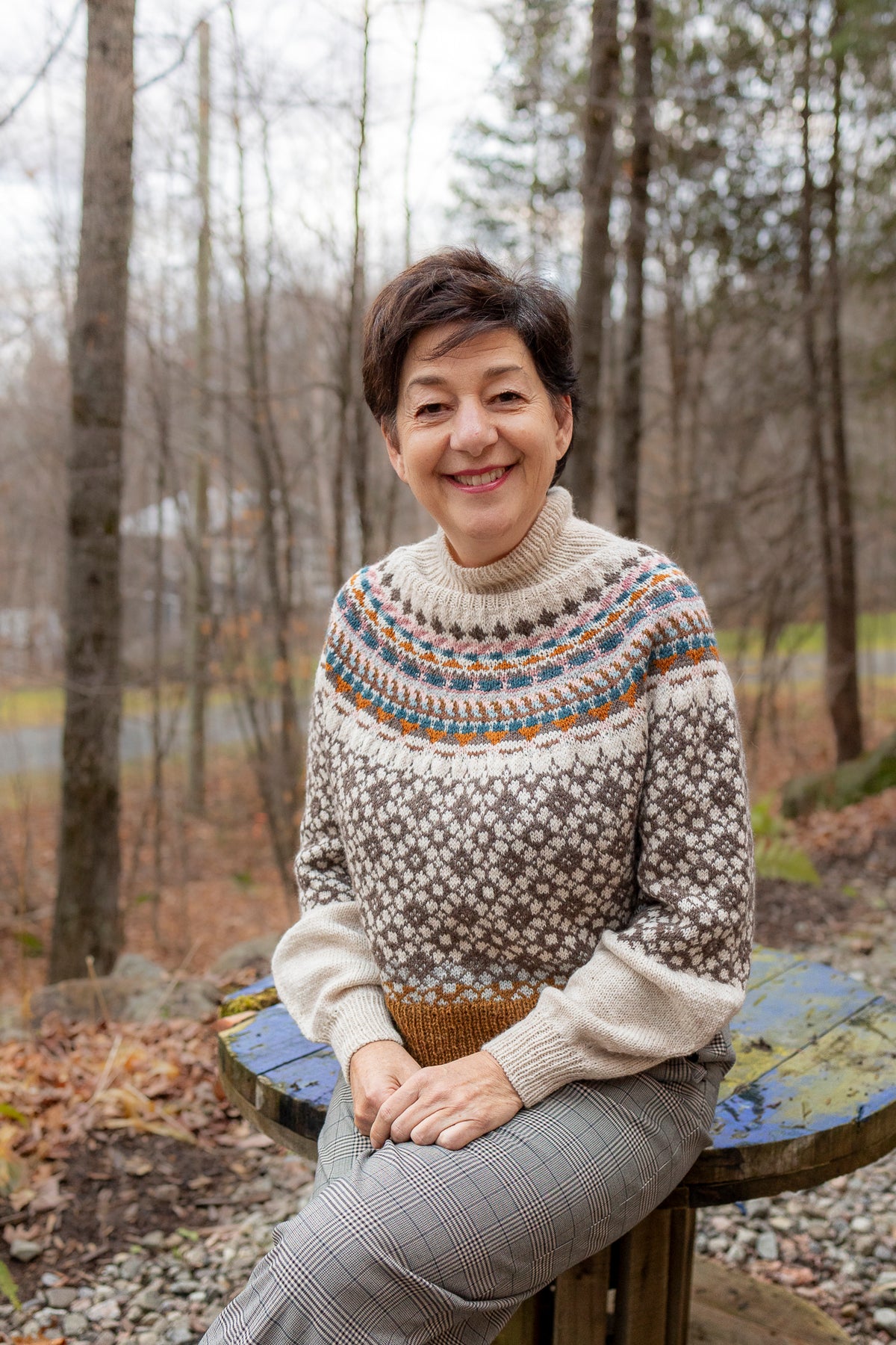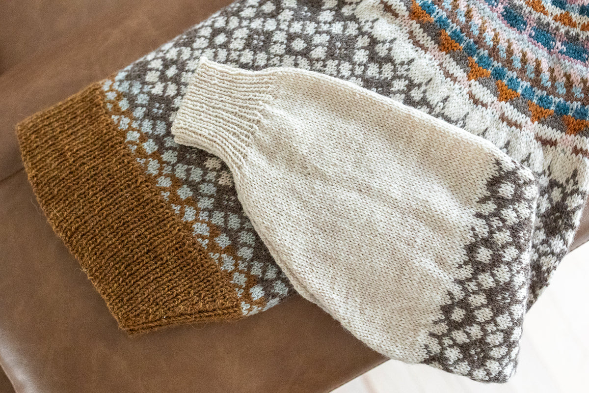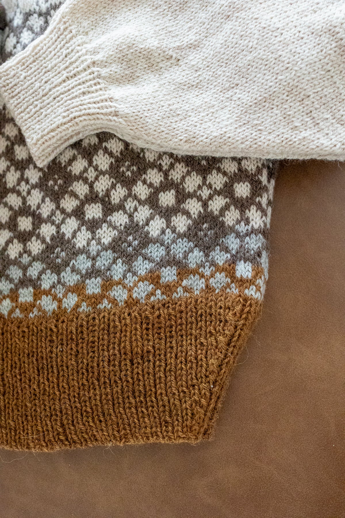 Ce pull a un petit col roulé, et est tricoté entièrement en rond, du haut vers le bas. L’empiècement est un peu resserré au niveau des épaules, puis s’élargit avec beaucoup plus d’aisance au niveau du corps et des manches. Le bas du corps est assez haut (« cropped » en anglais) et resserré au niveau de la bordure pour lui donner une allure arrondie flatteuse autour de la taille. Les manches de longueur-bracelet ont une forme arrondie, grâce à des diminutions placées sur la moitié du bas. Le bas des manches est ensuite resserré en poignets bien ajustés afin d’accentuer la forme ronde façon cocon de ce pull très moderne en Fair Isle.