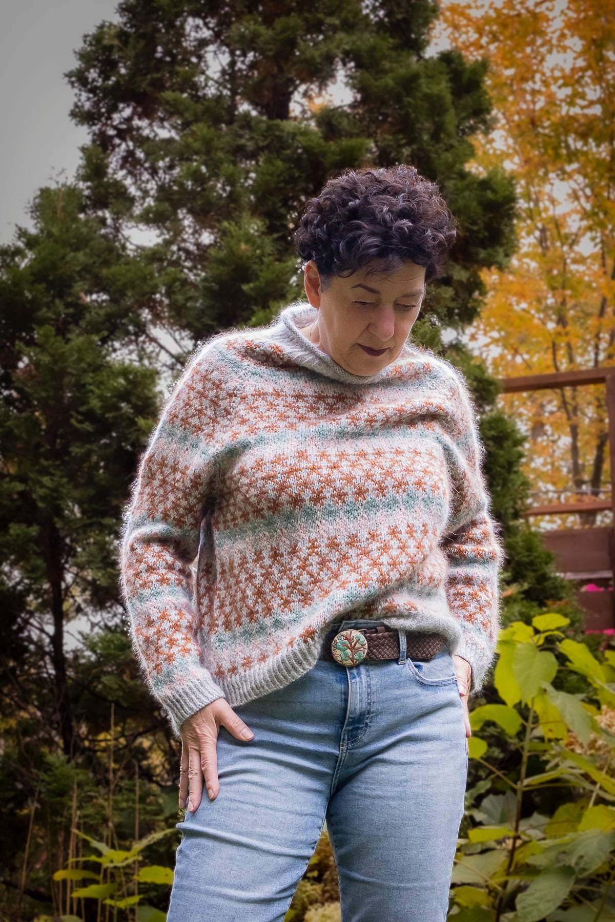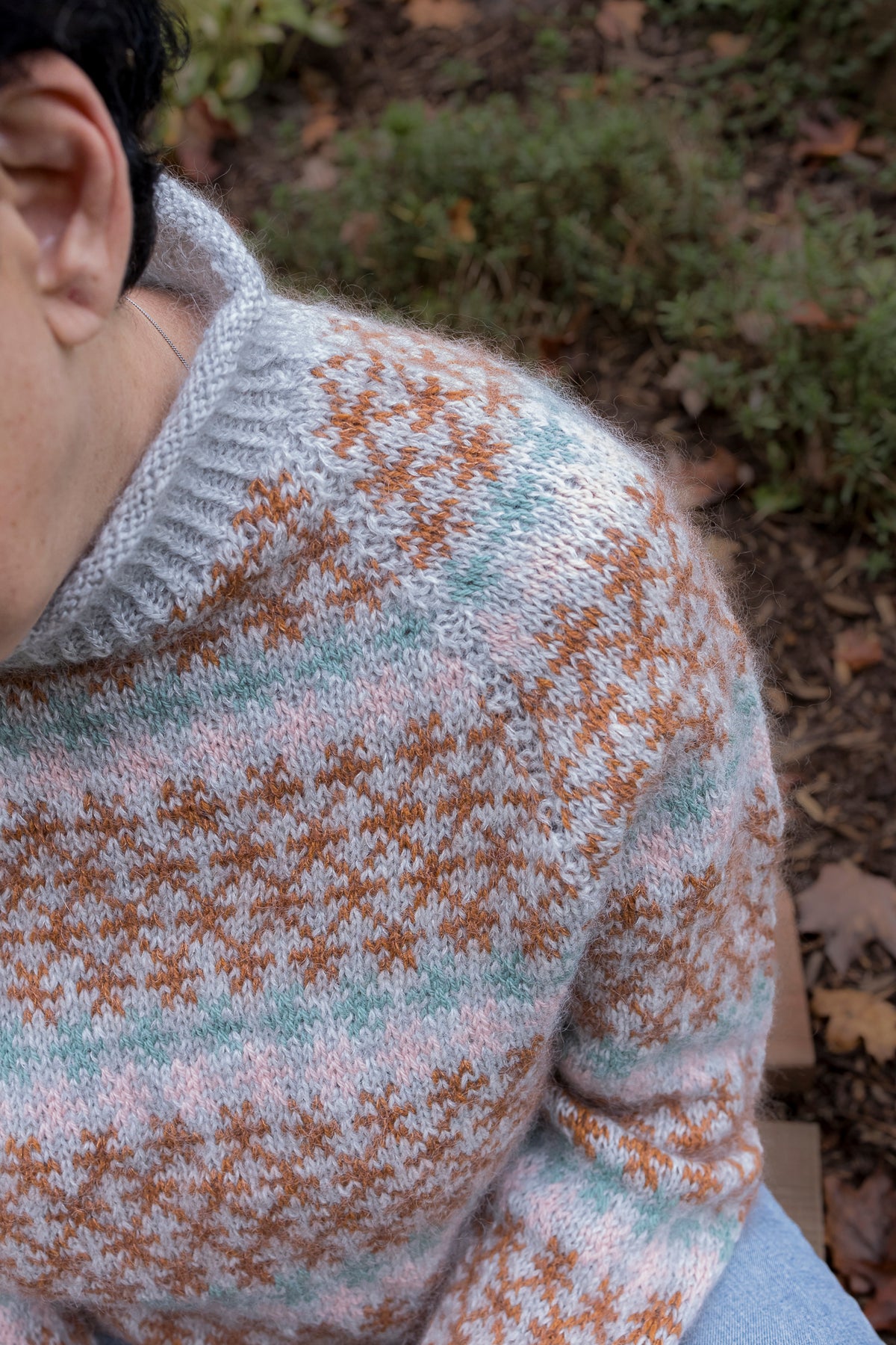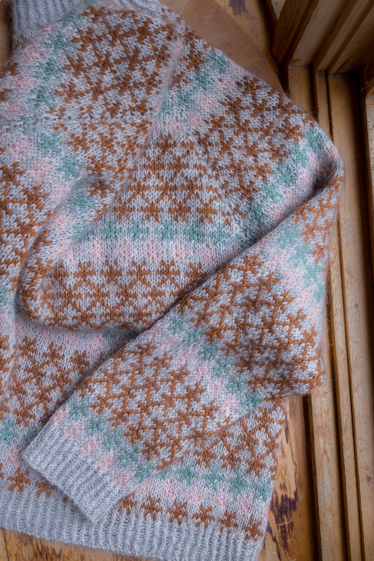 Coloured Crosses Senior est un pull adorable et doux avec un élégant motif à fils travaillé en quatre couleurs. Le pull est travaillé avec des détails de côtes torses et un bord doux et roulé au niveau du cou. Le motif est travaillé du haut vers le bas. Si vous suivez attentivement les instructions pour l'empiècement, le motif et les augmentations raglan deviennent symétriques et se rejoignent correctement aux emmanchures.