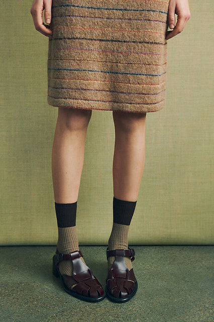 La jupe Gunta séduit par son style intemporel et sa coupe légèrement évasée qui flatte toutes les silhouettes. Tricotée dans une laine douce et chaleureuse, elle se distingue par ses fines rayures multicolores sur fond neutre, apportant une touche subtile d’originalité.