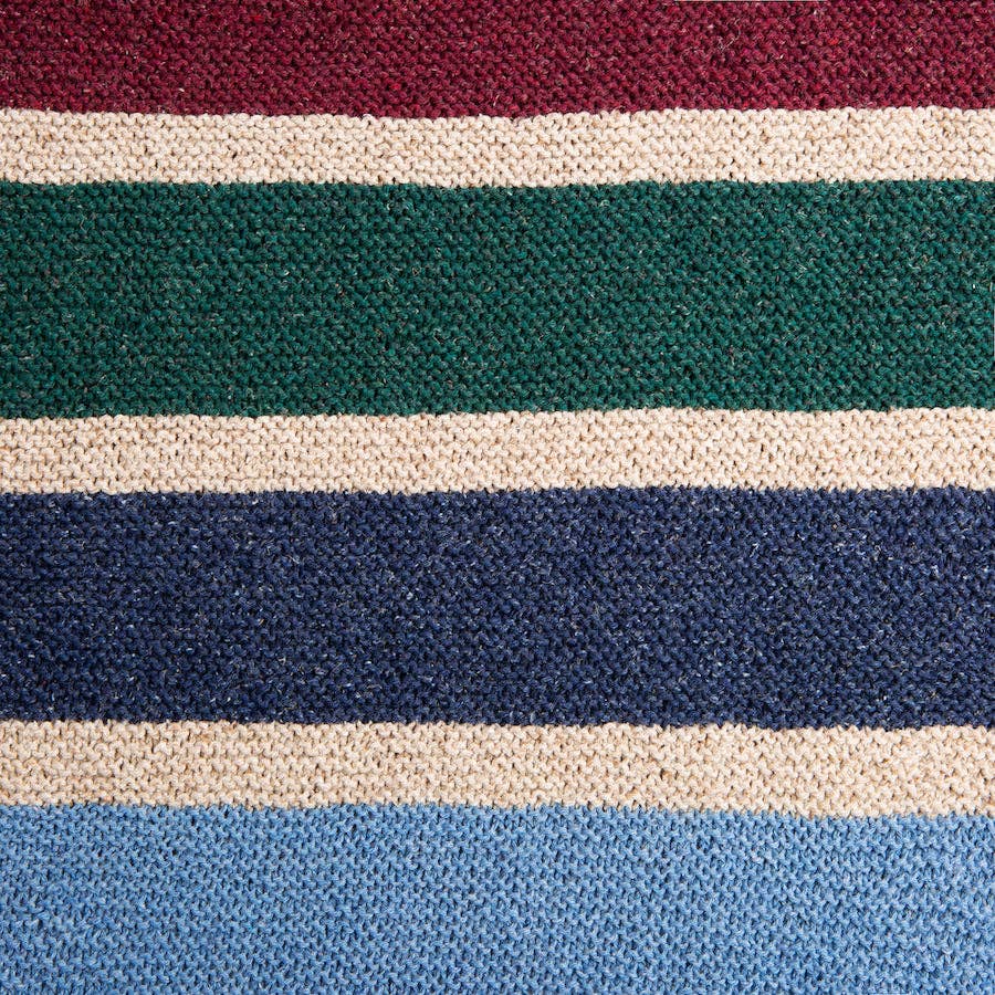 4 pelotes de fil Utterly Aran pour créer les rayures de couleur principale répétitives ( 28 % coton, 28 % fibres manufacturées – polyester, 20 % fibres manufacturées – acrylique, 10 % soie, 9 % cellulose – lin/chanvre, 5 % autres)