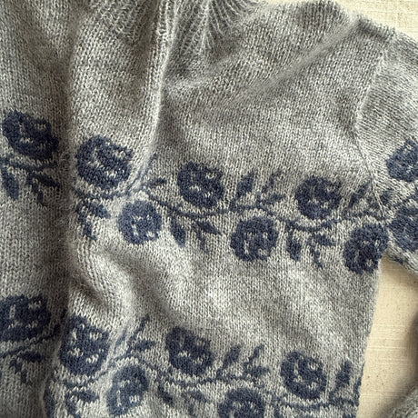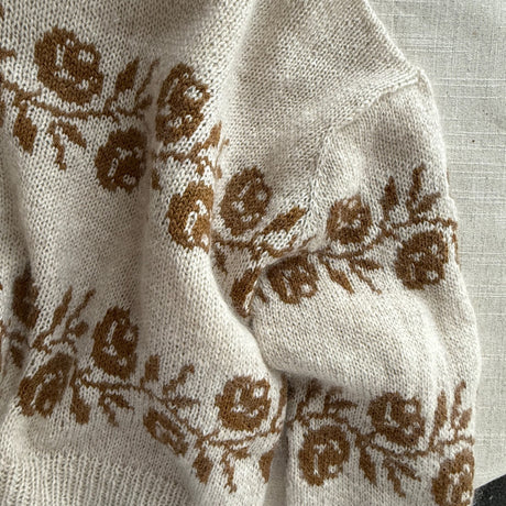 Le chandail Rosie présente deux bordures de roses sur le corps et les manches. Sa construction ingénieuse combine une épaule tombante et un empiècement raglan, ce qui permet de tricoter tout le jacquard en rond, sur l’endroit.