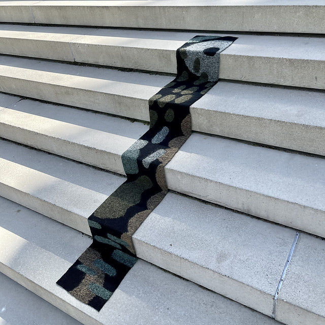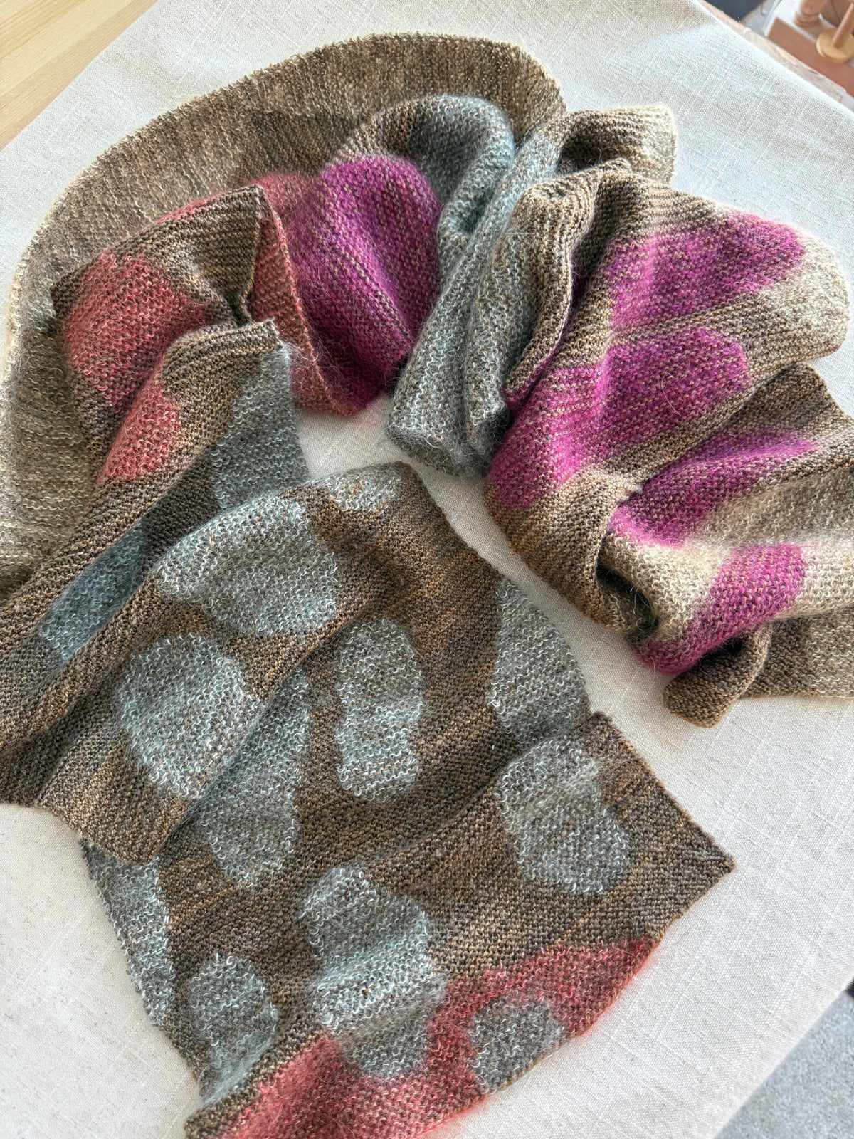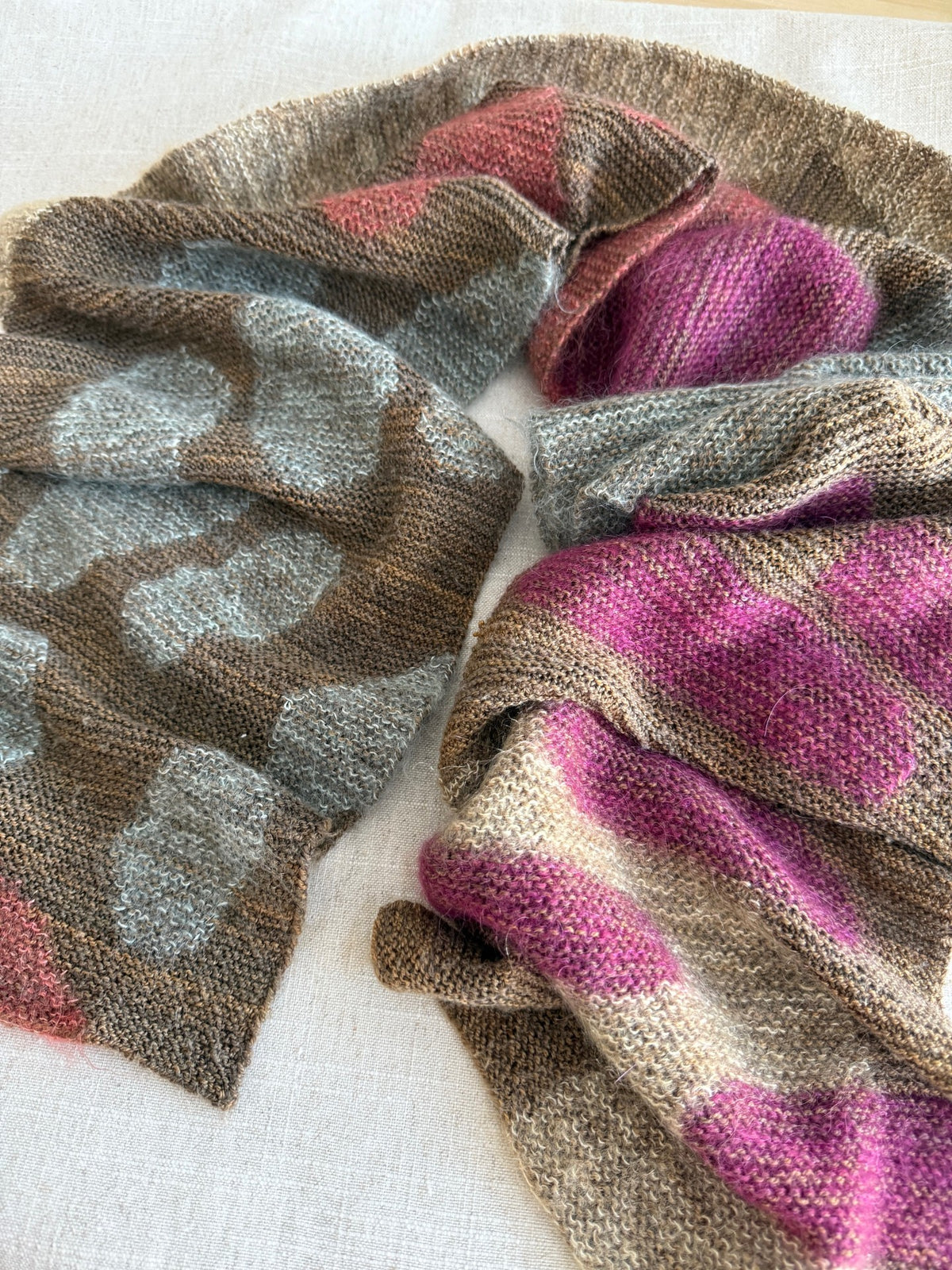 L’étole Silvatica est une écharpe légère tricotée au point mousse. Sa forme simple est mise en valeur par une technique semblable à l’intarsia. Un motif de formes abstraites se crée en tenant ensemble des brins de mohair contrastants avec un fil de base continu.