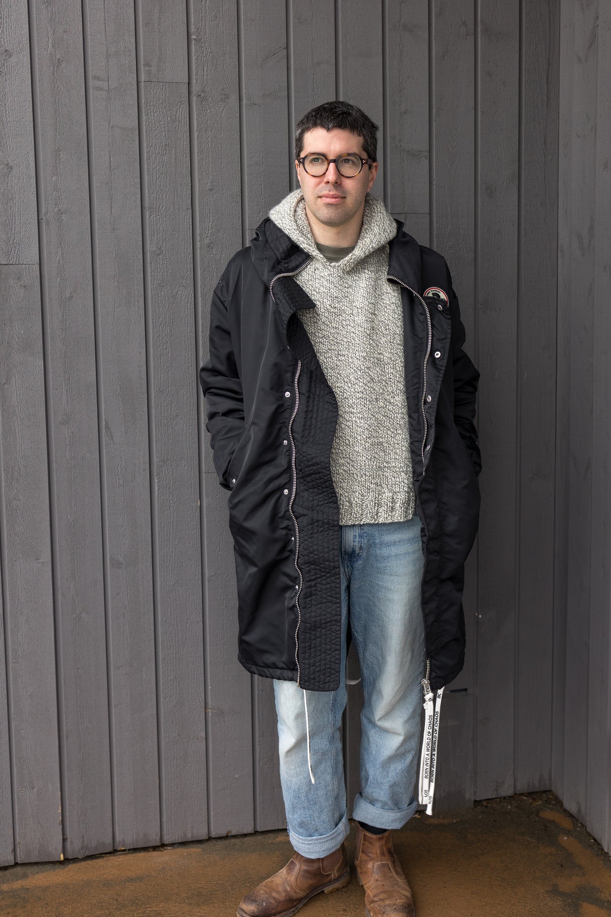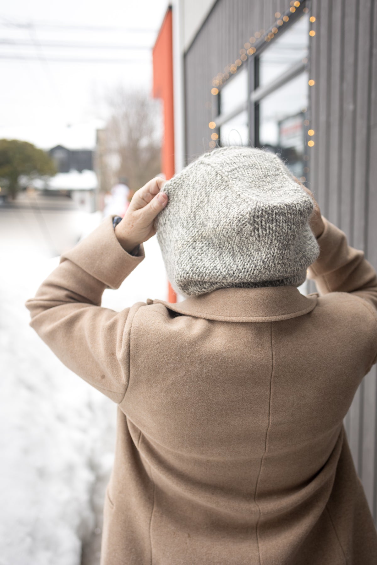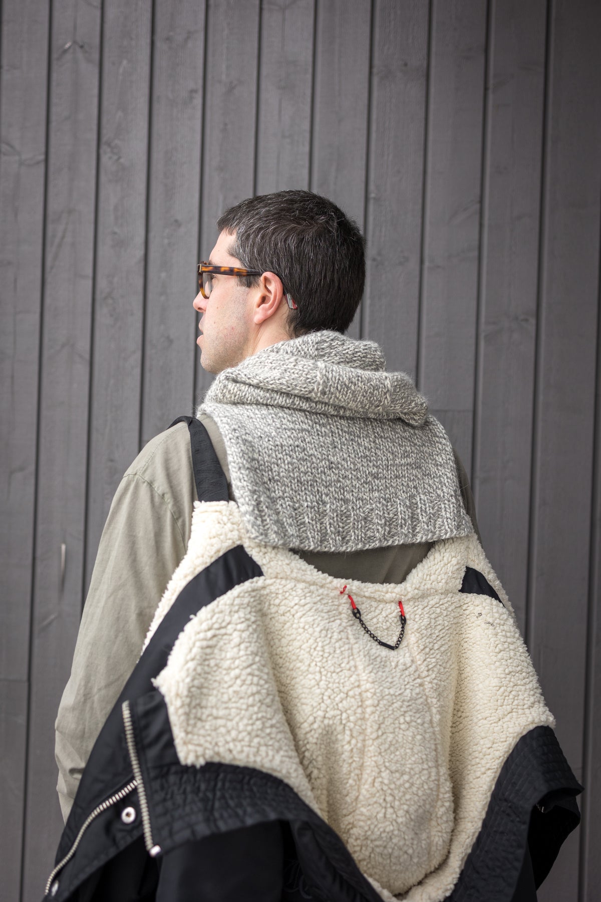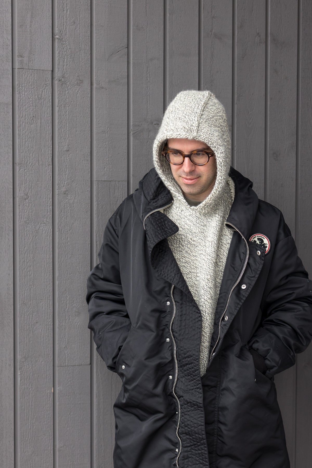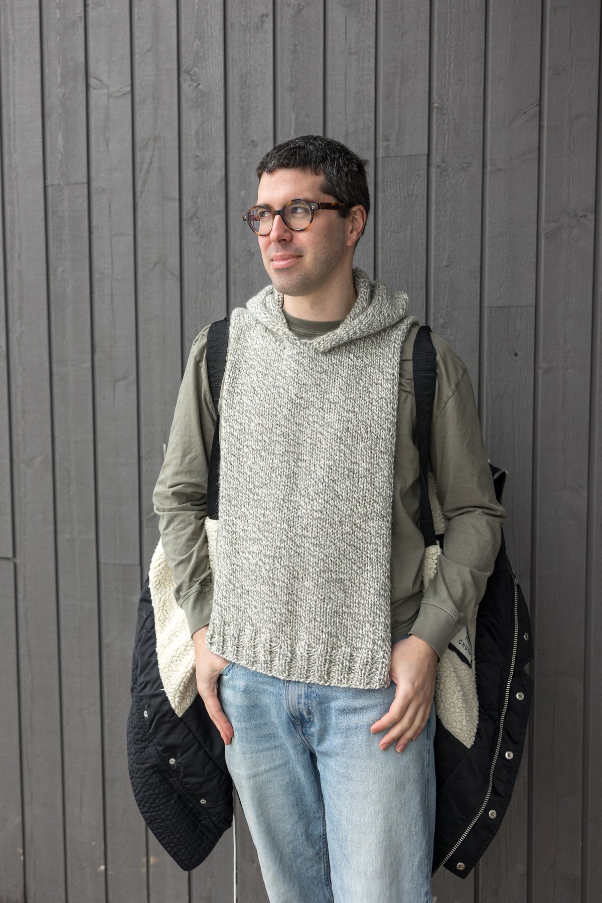 Ce projet se travaille de haut en bas. On commence par tricoter le dos, puis on reprend des mailles pour tricoter le devant. Les mailles sont ensuite reprises autour de l'encolure pour tricoter la capuche.