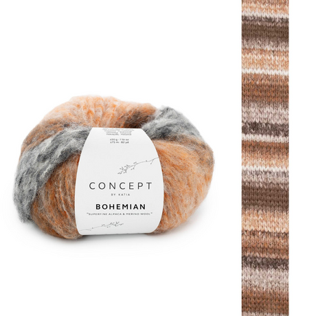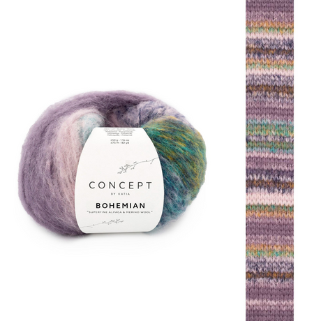 La quantité nécessaire selon la grandeur de Bohemian par Katia Concept (50% d' Alpaga Superfin, 32% de Mérinos, 18% de Polyamide)