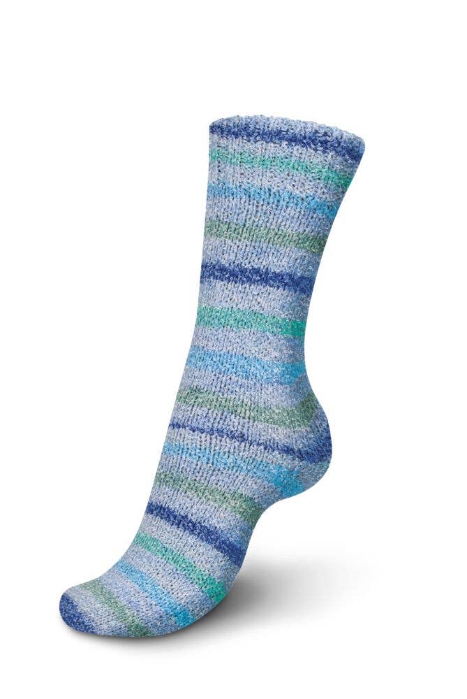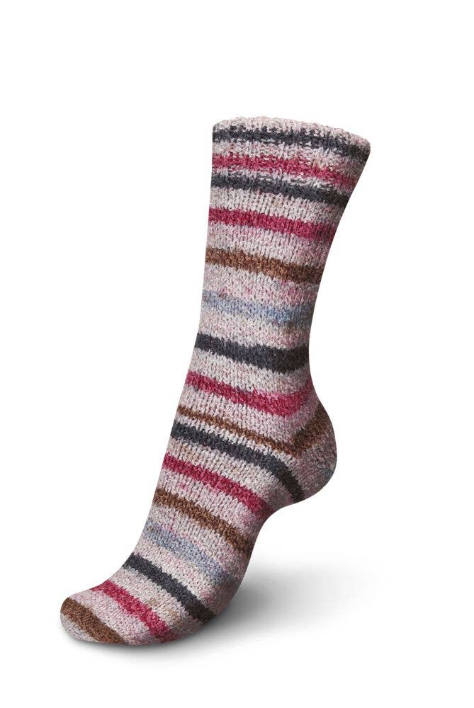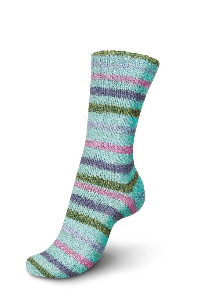 REGIA Energy Flow Color sock yarn stands out with its trendy block-stripe look. Its slightly looped texture gives it a unique appearance and a soft, cushioned feel. It’s pleasant to knit with, glides smoothly on the needles, and creates a soft, comfortable finished fabric—perfect for cozy projects.