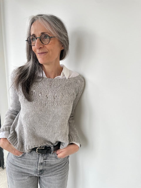 A favorite project of Sylvie's, the Ranunculus sweater is a round yoke sweater with lace and textured stitches. The combination of fine wool and a chunky needle gives this sweater a light, transparent and airy texture. It's a surprisingly quick project with a very loose swatch and large needles.