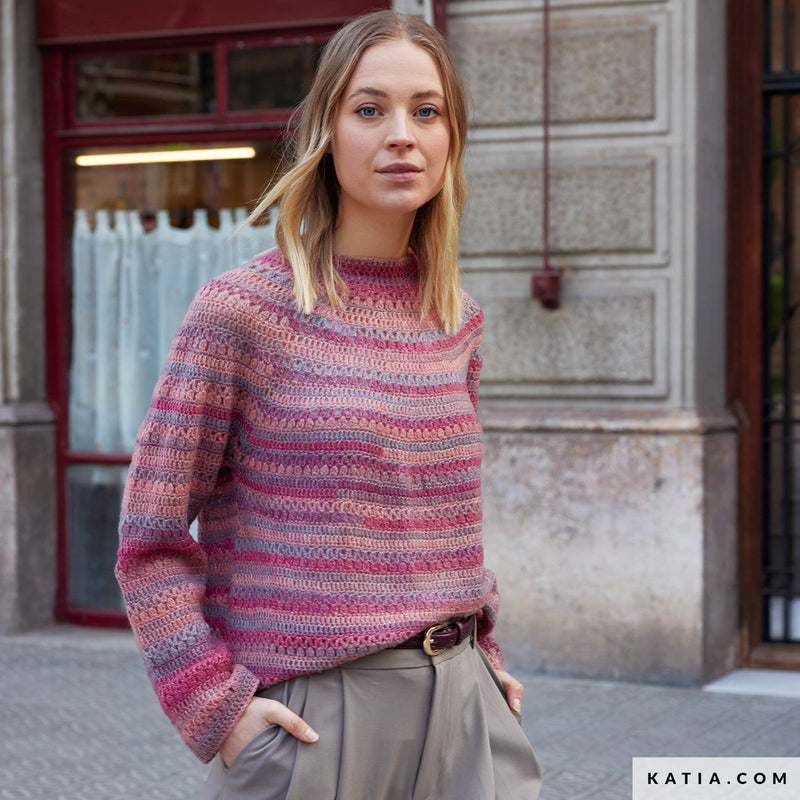 Crochet this beautiful sweater, both comfortable and stylish. With its subtle striped effect in shades of pink and plum, it’s perfect for everyday wear as well as outings, offering a casual yet refined look.