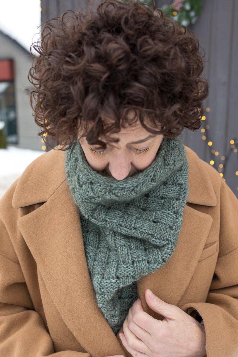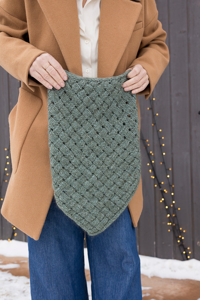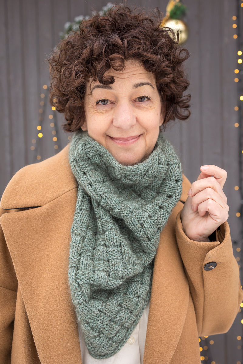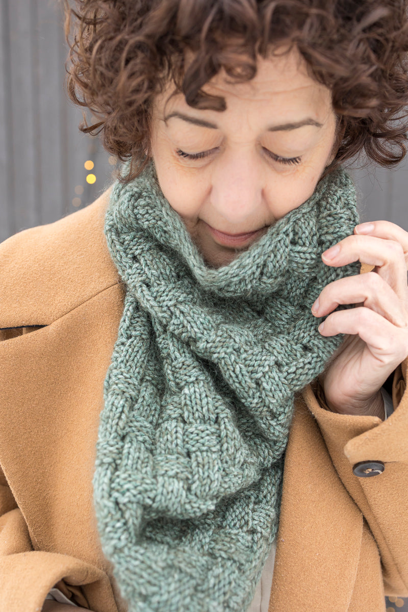 This cowl highlights the basketweave stitch, a textured pattern that evokes the elegance of a hand-woven basket. Bands of knit and purl stitches intersect harmoniously, creating a play of relief that gives the piece depth and character.