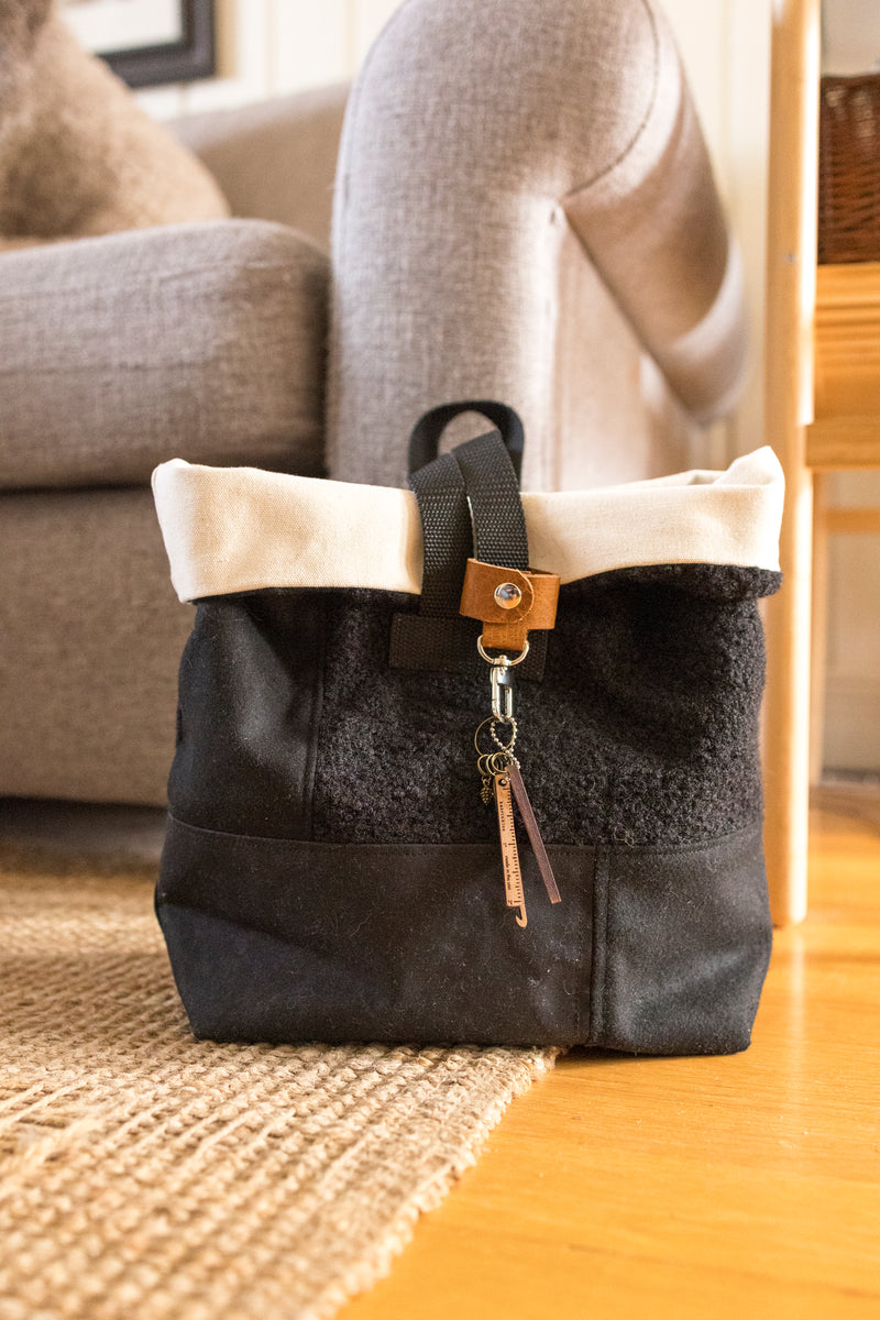 Here’s the elegant leather clip with a snap button and carabiner to attach the Mignonne and hang it from a handle of your knitting bag. Or use it to hang your scissors, markers, measuring tape or any other useful accessory. Ingenious! The Accrocheur has that je ne sais quoi that pairs perfectly with various Pure Laine x Cin bag models. A new must-have!