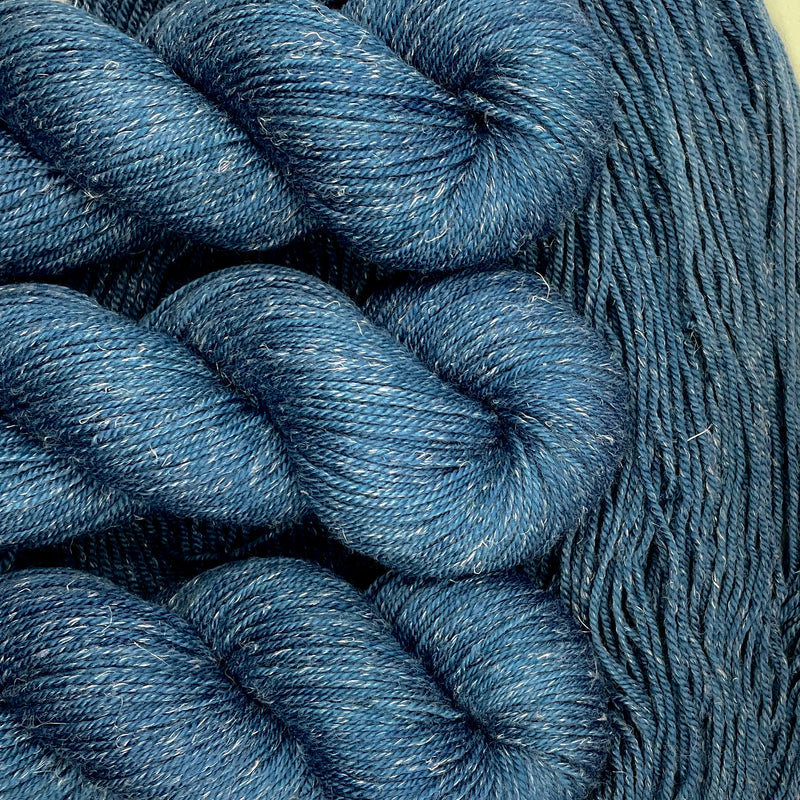 Ce mélange a été créé par Marie-Josée, qui est la teinturière derrière Pause sur le temps. Il est donc unique et exclusif! Le mérinos non traité est plus naturel et plus rustique, le lin, qui donne la touche tweedé au fil, et la soie, qui amène la douceur, font de ce fil un incontournable pour tous les amoureux de belles fibres! Le saviez-vous que le lin n'absorbe pas les mêmes teintures que les fibres naturelles? C'est pour cela que la amulette a un air tweedé. C'est le lin qui reste de couleur naturel.