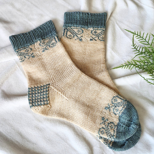 Eirlys est un patron de chaussettes en fingering qui séduit par son élégant motif floral en jacquard et son talon bicolore travaillé en œil de perdrix. Inspiré des fleurs d’hiver, ce modèle marie délicatesse et chaleur pour offrir des chaussettes à la fois raffinées, confortables et soigneusement finies.