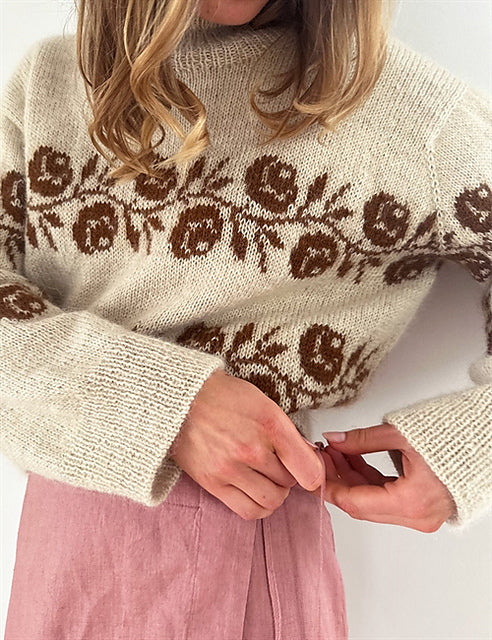Le chandail Rosie présente deux bordures de roses sur le corps et les manches. Sa construction ingénieuse combine une épaule tombante et un empiècement raglan, ce qui permet de tricoter tout le jacquard en rond, sur l’endroit.