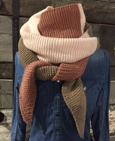 Kit pour faire ce foulard trois couleurs. Le patron est très simple à réaliser. Il ne demande que des mailles endroits, des augmentations et diminutions. Vous allez tricoter les trois balles au complet, donc aucun restant!