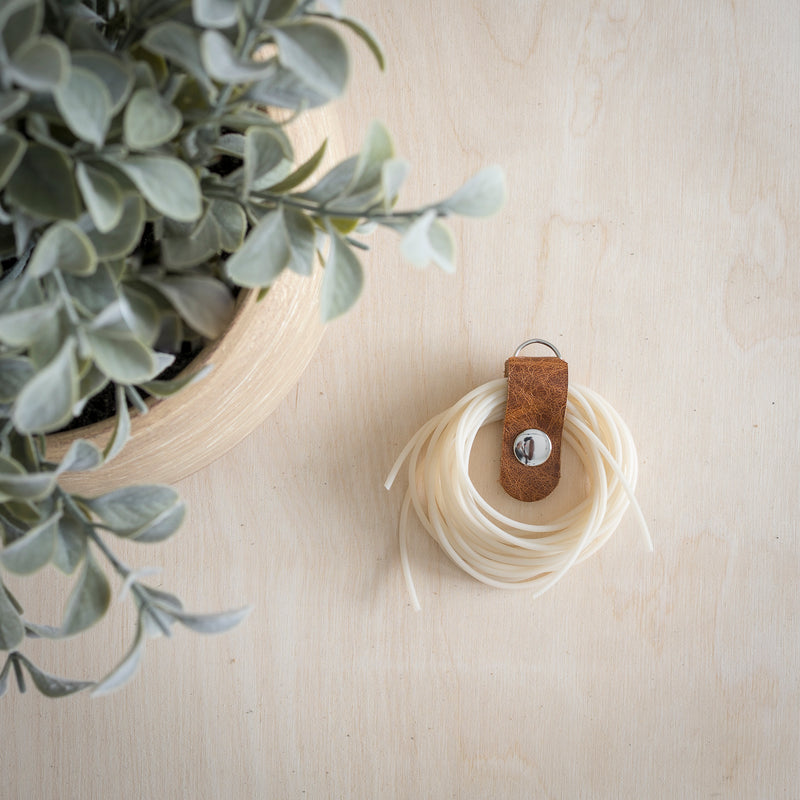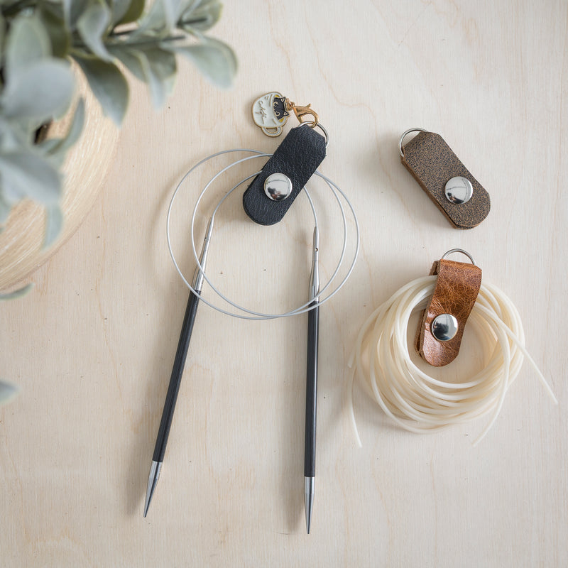 Ces attaches en cuir sont conçues pour garder vos câbles d’aiguilles circulaires bien organisés. Simples et pratiques, elles permettent de maintenir les câbles enroulés et évitent les enchevêtrements dans votre sac à projets. Un accessoire discret et durable, idéal pour un rangement soigné de vos outils de tricot.