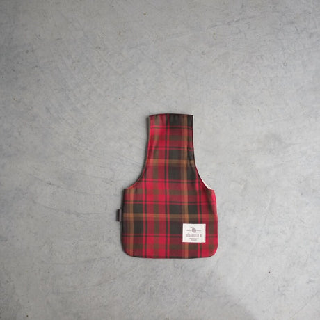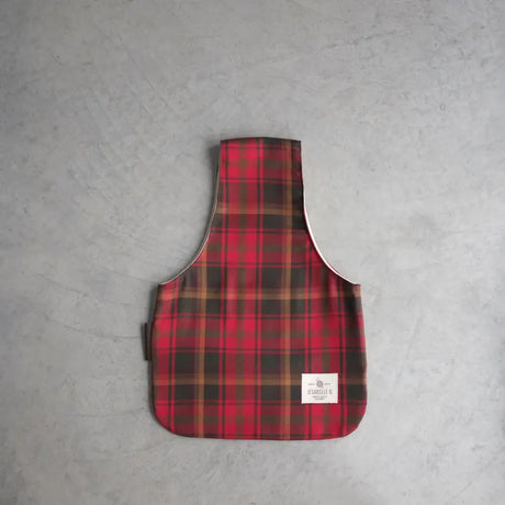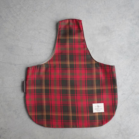Il est fait de tissus à carreaux rouge profond, vert forêt et une ligne de brun doré à l'extérieur et un coton beige naturel à l'intérieur. Il a une petite étiquette de cuir sur le côté.