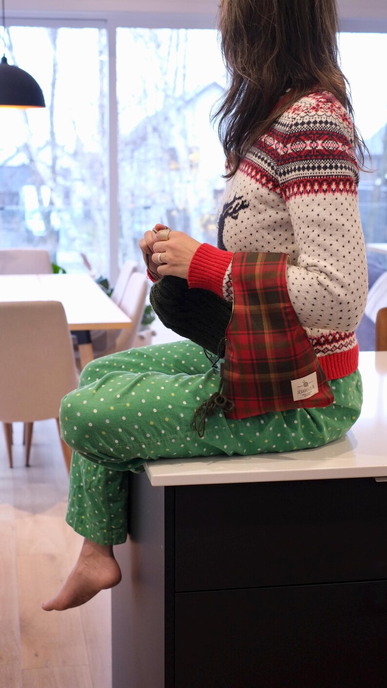Pochette de tricot pour y mettre la laine et tricoter les mains libres.